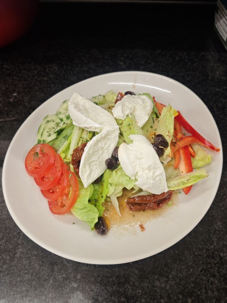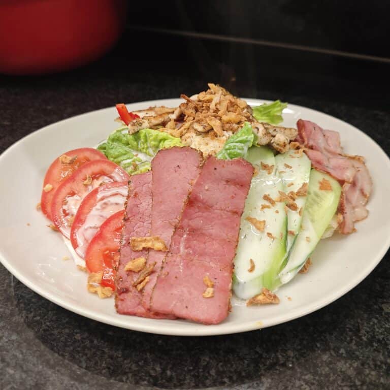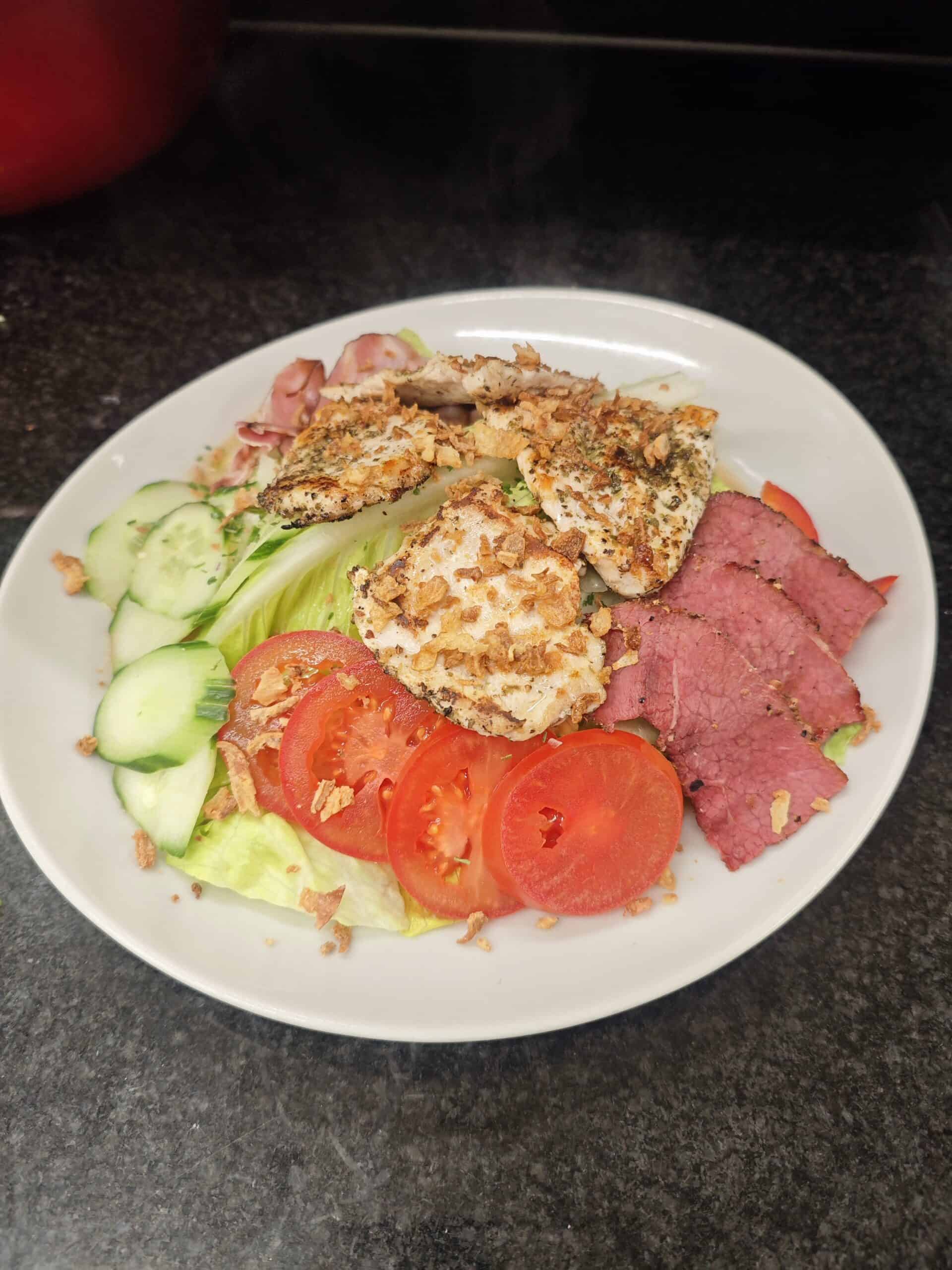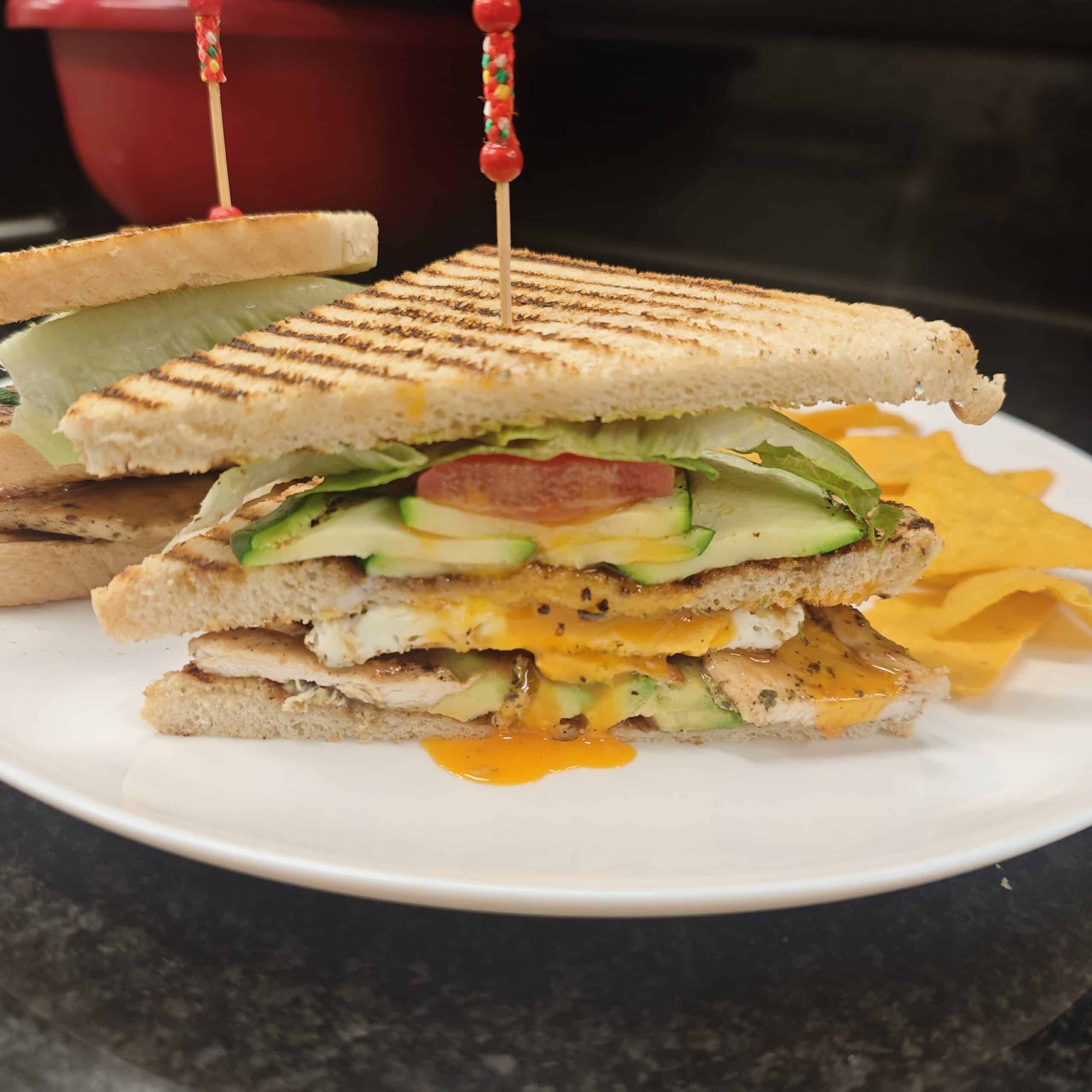 Weizentoast, Avocado, Teriyakisoße, Kokos-Sojasoße, Hähnchen, Wasabi, Zucchini, Tomaten, Salat